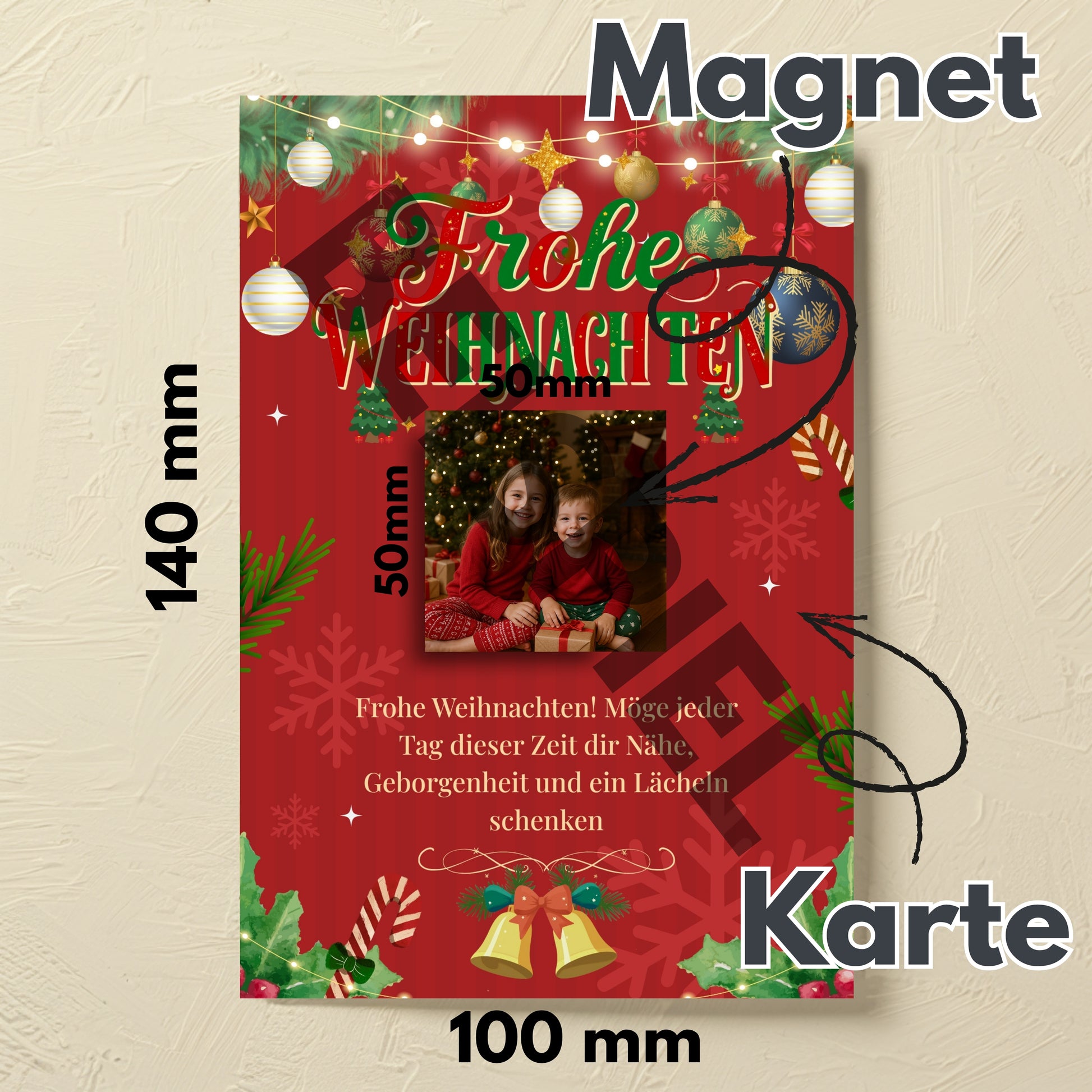 Unsere Weihnachtskarte im Format 10×14 cm kommt zusammen mit einem 5×5 cm Fotomagneten, der euer persönliches Bild trägt und die Karte überall sichtbar macht – ob am Kühlschrank, an der Magnetwand oder jedem anderen metallischen Ort.
